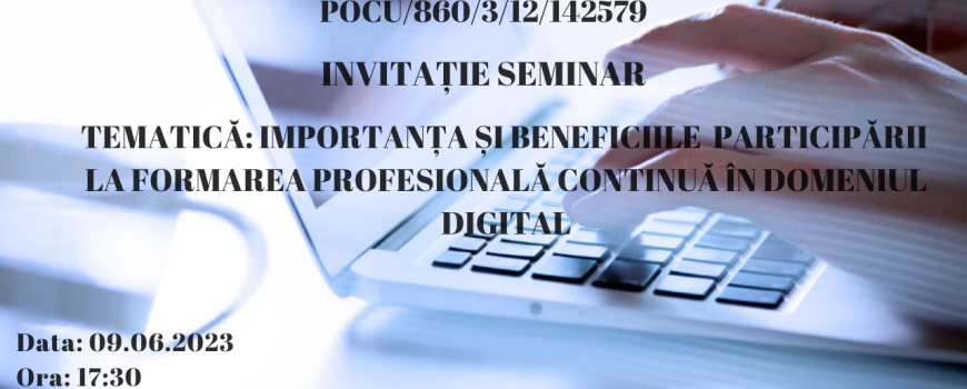 📢Vă invităm la un nou seminar de promovare a importanței și beneficiile participării la formarea profesională continuă în domeniul digital organizat în cadrul proiectul ”S.O.F.T. – SUSȚINEM OCUPAREA PRIN FORMARE TEHNOLOGICĂ”, POCU/860/3/12/142579, care va avea loc de data aceasta în Baia Mare. 🟢Când? Vineri, 9 iunie 2023, de la ora 17:30 🟢Unde? Universitatea de Vest[…..]